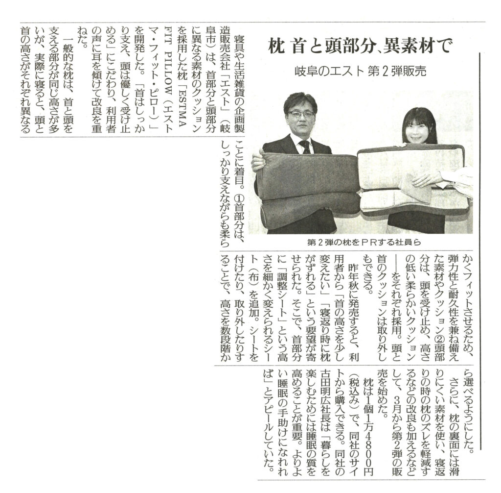 本日は嬉しいお知らせがございます! この度、読売新聞にて私たちの自信作である新作枕「ESTMA FIT PILLOW(エストマ・フィット・ピロー)第2弾」について大きく取り上げていただきました。