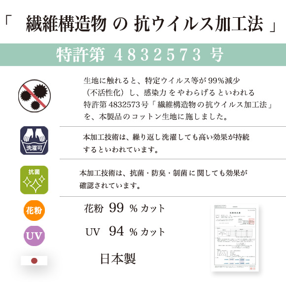 特許第4832573号「繊維構造物の抗ウイルス加工法」を施しました。