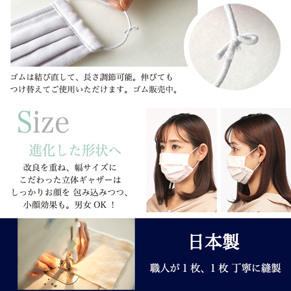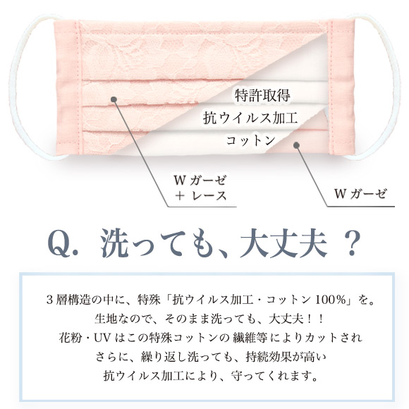 Wガーゼと、Wガーゼの間に、コットンウイルス加工生地を入れた3層仕立てのマスク。