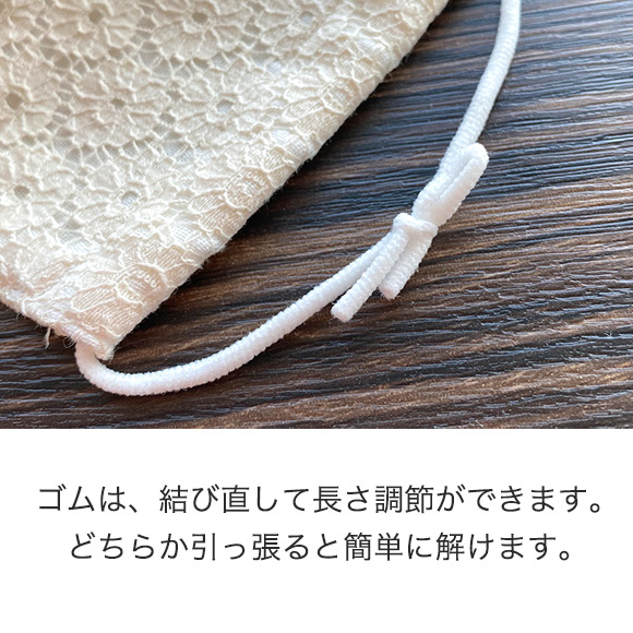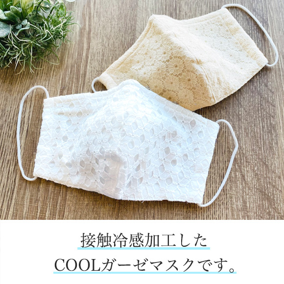 接触冷感加工、COOLガーゼを使用。キシリトール特殊樹脂を使用することにより、清涼感が得られる、快適な素材で作りました。お洋服に使用する繊細なレースで涼やかでおしゃれ。