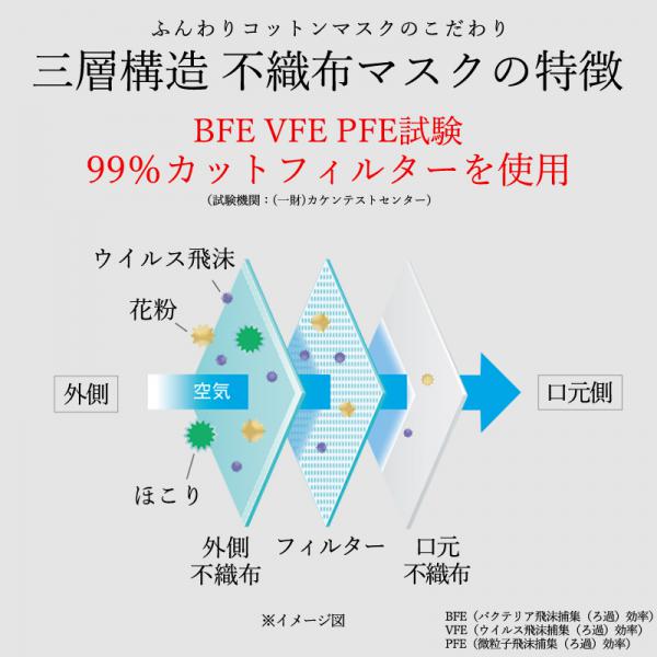 ・BFE(バクテリア飛沫捕集(ろ過)効率)、VFE(ウイルス飛沫捕集(ろ過)効率)、PFE(微粒子飛沫捕集(ろ過)効率)99%カットフィルターを使用しています。(試験機関:カケンテストセンター)