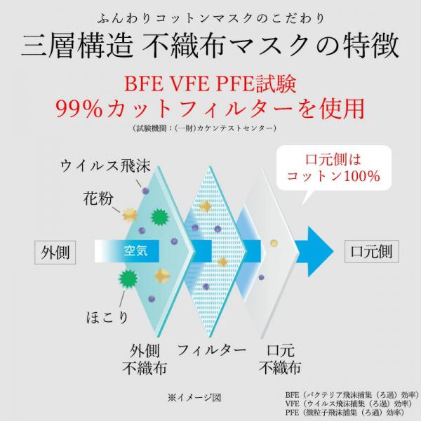 99%カットフィルターを不織布で挟んだ三層構造になっており、空気中のウイルス飛沫、花粉などの侵入を防ぎます。